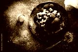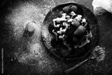 Top view of homemade waffles with chocolate, icing sugar, strawberries and raspberries on dark dish. Messy look flat lay.