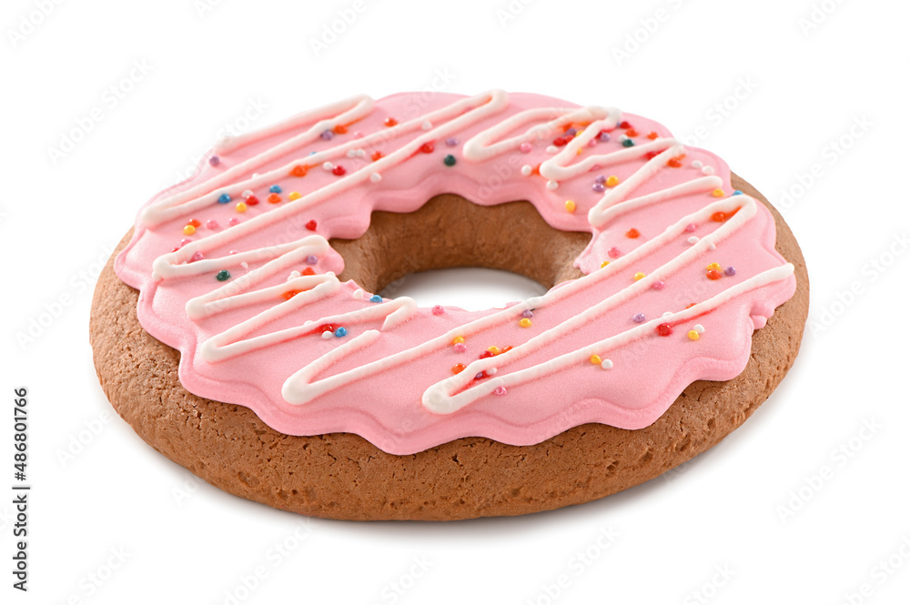 traditional round gingerbread with pink icing and decorative sprinkles close-up isolated on white background