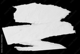 White paper ripped pieces isolated on black background. Dirty wrinkled glued paper poster texture