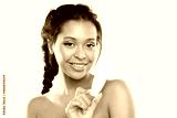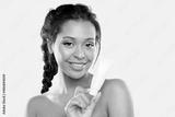 Pretty black girl holding mock-up tube with cream, moisturizing lotion for caring about skin health. Mixed race female with naked shoulders, closed eyes. Beauty treatment, skincare concept.