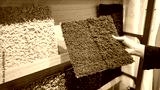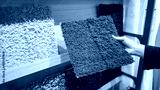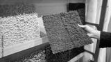 Male hand choosing color and texture of synthetic carpet or rug samples in furniture store showroom. Interior design and home decoration concept.
