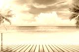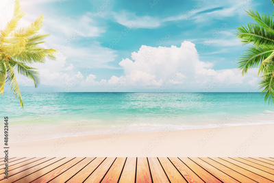 Blur tropical beach with bokeh sun light wave and palm tree on empty old wood table abstract background.