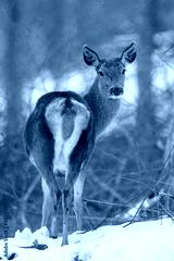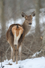 Deer in the winter forest. Animal in natural habitat. Wildlife scene