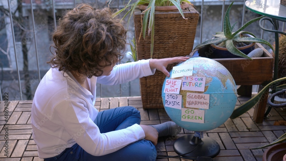7 years boy child looking Earth globe with stickers with the message Save the Planet, Help and No Plastic, Recycling, Concept save our planet and climate change due global warming - it's our future