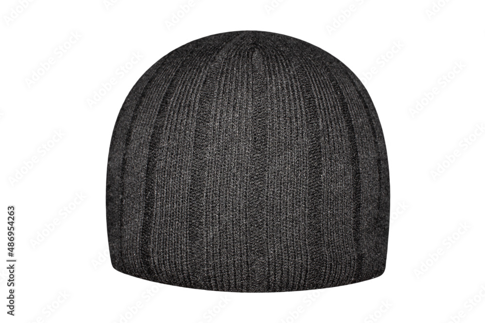 Black wool knitted hat on a white background.Knitted black hat without a collar.