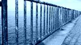 Rusty iron railing, beautiful sea and sky landscape view between oxidized railings gap.