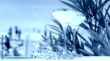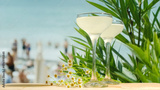 Two drinking glasses of gimlet cocktails. Beach bar. Summer alcoholic cocktails on table bar, sea on background.