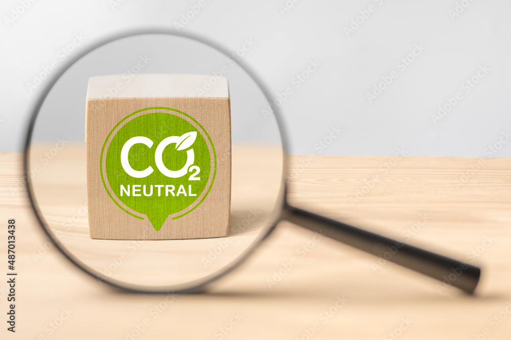 CO2 Neutral. CO2 Neutral sign through magnifying glass on wooden table. Reduce carbon dioxide emissions and limit global warming and climate change.