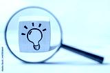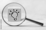 Magnifying glass with light bulb icon. Concept creative idea and innovation. Idea and imagination. Creative and inspiration. Magnifying glass with light bulb on a wooden background