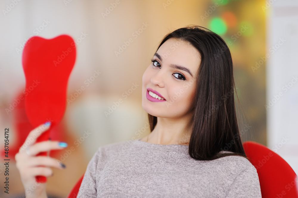 Beautiful girl in dental chair smiling. A young woman is satisfied with the result of the dentist's work