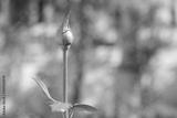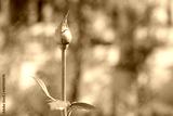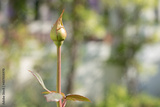 a single rosebud growing on a bush with greenery in the background. a bright beautiful red rose flower bloomed in the garden on a summer afternoon. Selective focus on the flower bud.