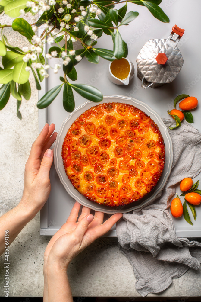 Preparing breakfast with Kumquat Upside Down Cake and coffee. Woman hands. Homemade. Top view.