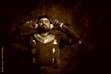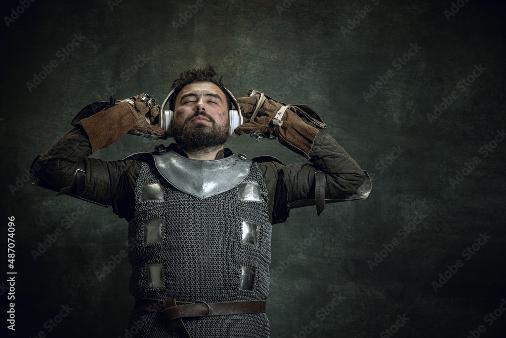 Romantic medieval warrior or knight with dirty wounded face in headphones listening to music isolated over dark vintage background. Comparison of eras, history