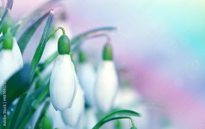 White snowdrops flower in sunny garden . Easter background.