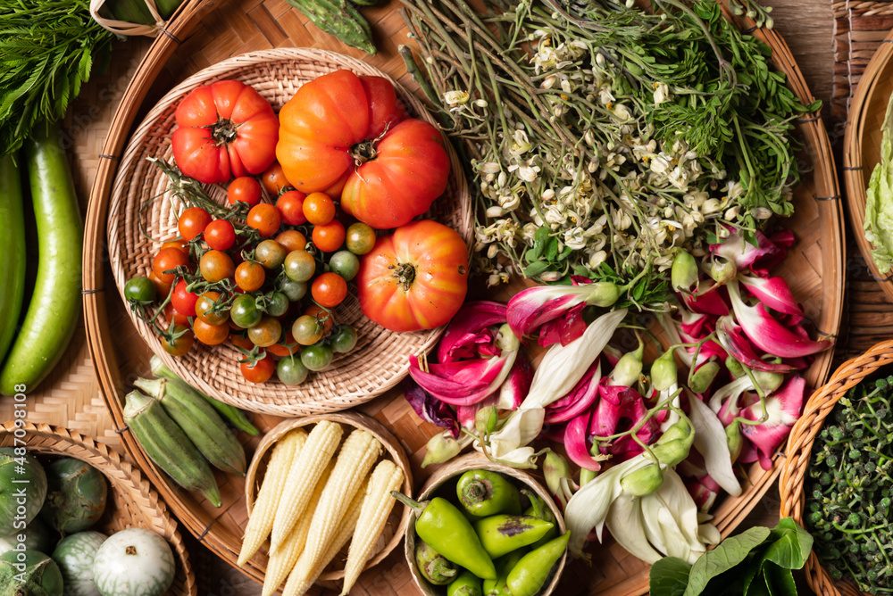 Fresh organic Southeast Asian vegetables and edible flowers from local farmer market, Northern of Thailand, Sustainability concept