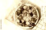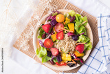 Fresh mixed fruits and vegetables salad in natural plate on white background, Healthy vegan food