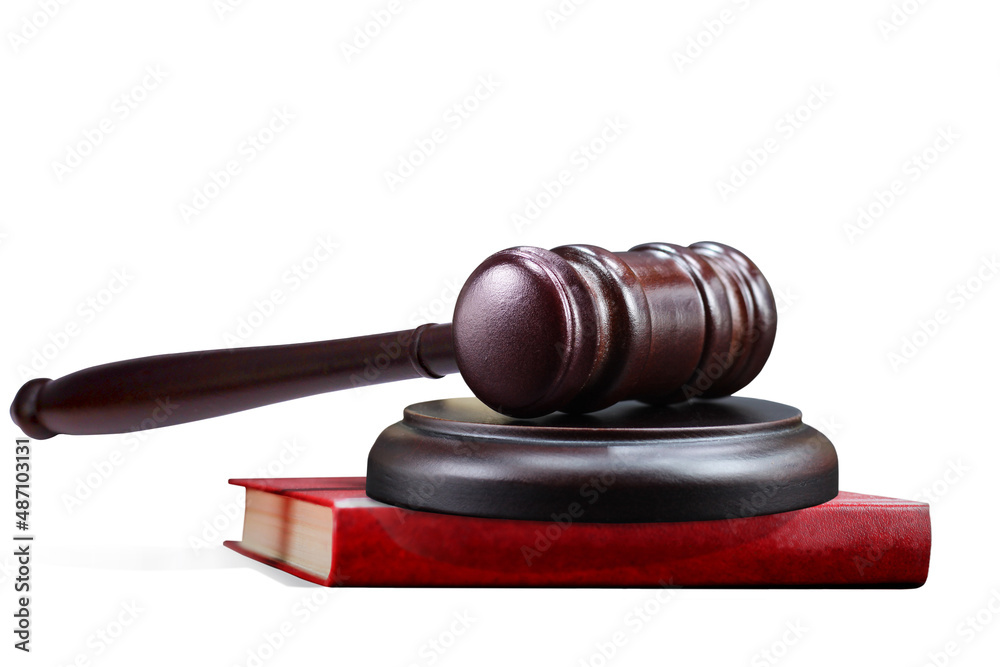Abstract photo with wooden gavel and red book with codes on white background as symbol of of rule of law with judge's gavel, justice with judge's gavel and force of law with udge's gavel