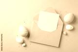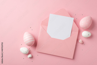Top view photo of easter decorations open pink envelope with paper sheet confetti pink and white easter eggs on isolated pastel pink background with blank space