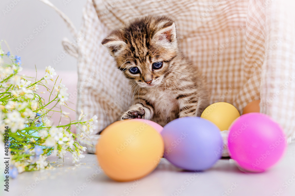 A striped kitten among Easter multicolored eggs