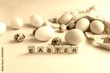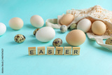 Easter eggs with natural decor. Zero Waste Easter Concept. Natural rustic eggs in a string bag on a blue background.