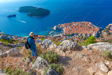Photographer traveler takes a photo of aerial view of Old Harbour and Fort St Ivana in Dubrovnik, Croatia