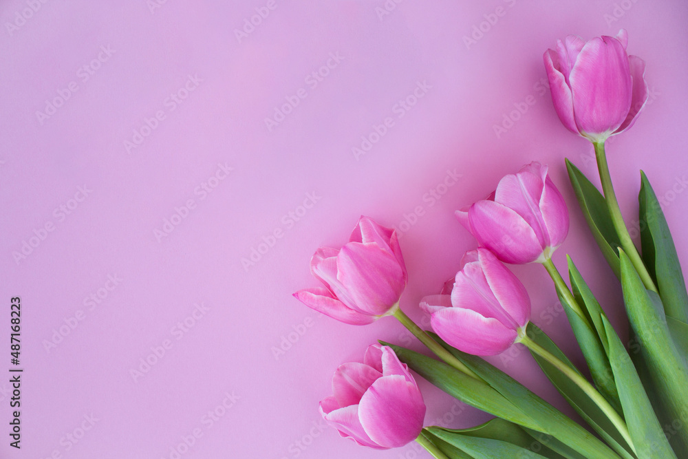 Top view on pink tulips on the pink background. Copy space. Spring background.
