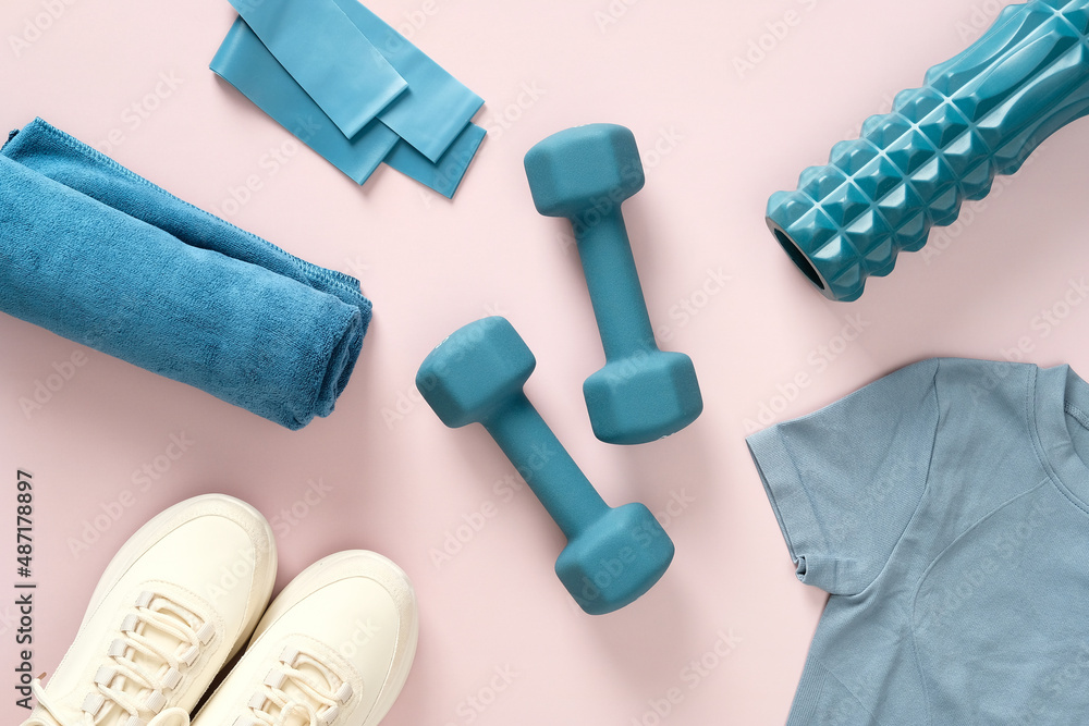Dumbbells, fitness tape, towel, female sneakers and t-shirt on pink table. Workout equipment top view.
