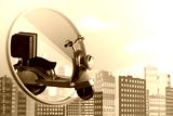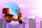 Red scooter on city background. Courier scooter. Rendering of delivery man's motorcycle. Motoroller symbolizes carrier's transport. Place for text. Work in courier business. 3d rendering.