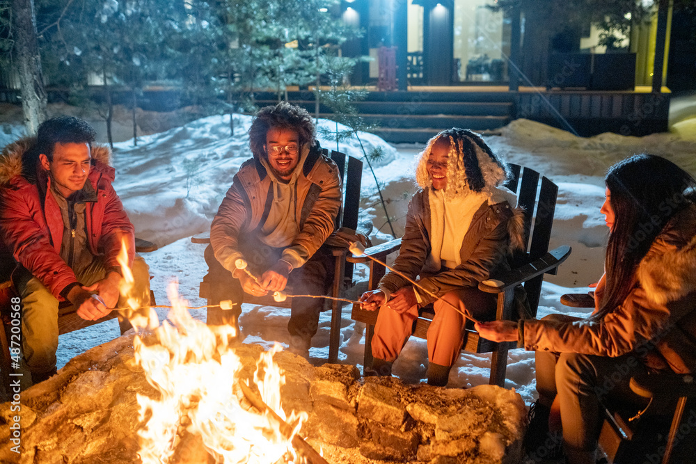 Group of happy friends sitting on chairs and cooking marshmallows near the fire during their winter vacation in the country house