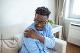 Pain in his shoulder. Upper arm pain, People with body-muscles problem, Healthcare And Medicine concept. Attractive young man sitting on the sofa and holding painful shoulder with another hand.