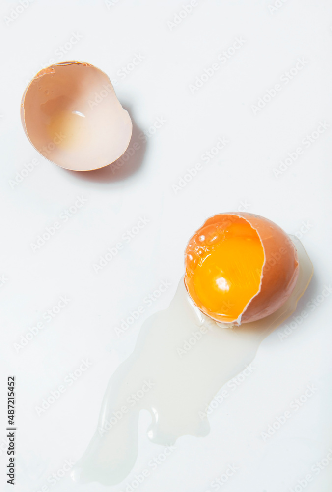 Breaked egg shell yolk egg white on white background vertical