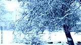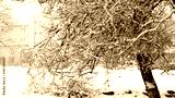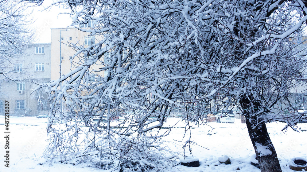 Winter landscape with snow in the city park, snowy trees with houses on background.