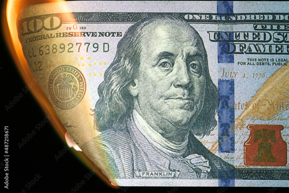Close up shot of a 100 dollar banknote burning