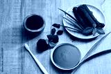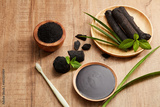 Flatlay of bamboo activated charcoal and charcoal mask and scrub , toothbrush decorate in wooden dish with green leaf in wooden background