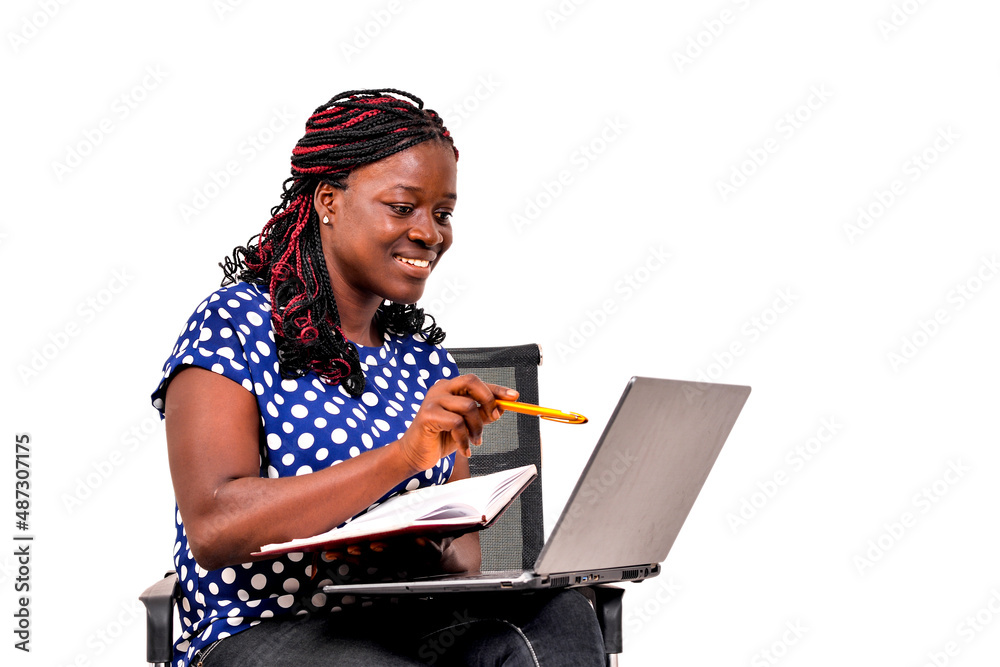 portrait of a beautiful businesswoman working using laptop and holding notepad, smiling.