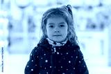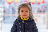 Portrait of a blonde little girl on a blurry background in a shopping mall.