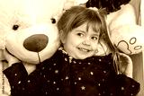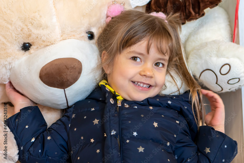 Portrait of a blonde girl among big teddy bears, children's toys in a store, selective focus.