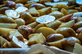 ripe raw cut potatoes wedges spiced on baking tray background closeup