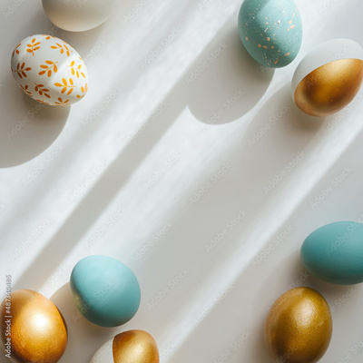 Golden and blue Easter eggs on on white background. Holiday concept. Happy Easter card with copy space