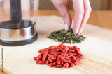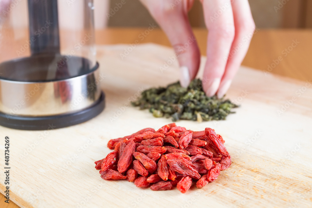 Teapot, green tea, goji on the table closed up