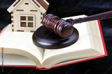 Abstract photo with wooden gavel and abstract house on book with codes on black background as symbol of law with judge's gavel and justice with judge's gavel and force of law with udge's gavel
