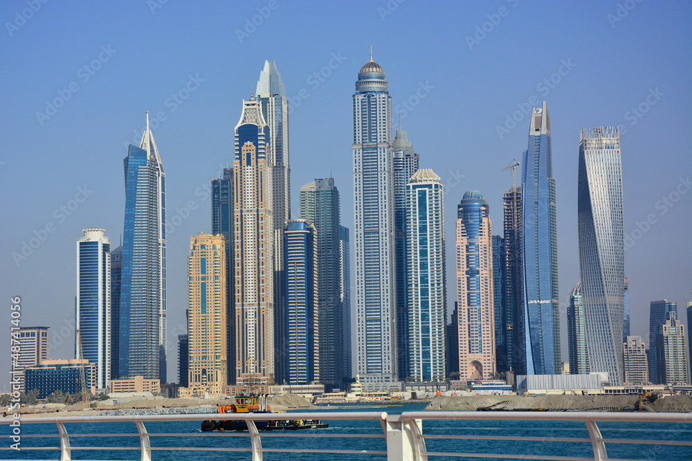 Dubai, UAE - View at skyscrapers from man-made, artificial Palm Jumeirah Island