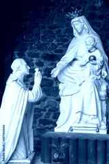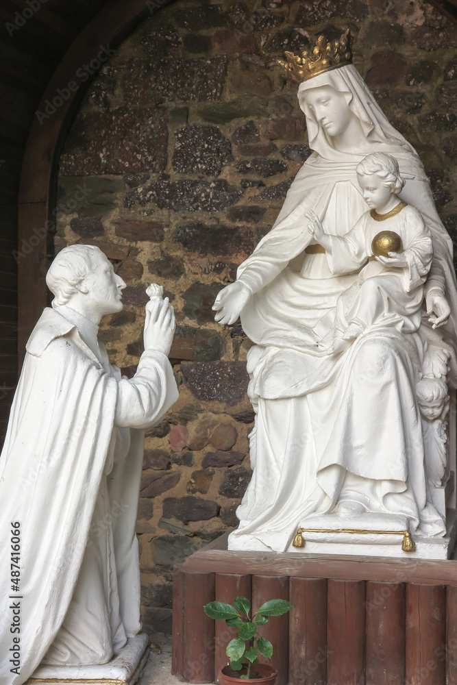 Montfort-sur-Meu, France, September 9, 2016: Place associated with the birth of St. Louis-Marie Grignion de Montfort. Figure of Louis Montfort kneeling in front of Mary