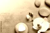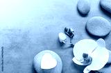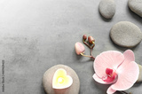 Flat lay composition with spa stones, orchid pink flower and heart on grey background.