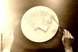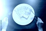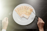 Money on a plate with a fork and knife. Euro banknotes. Wealth and the greed of cash. Business.