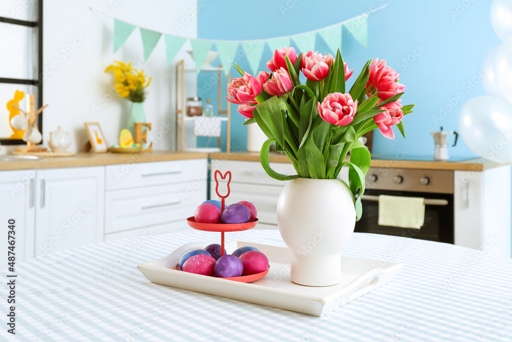 Stand with Easter eggs and vase with tulips on dining table in kitchen