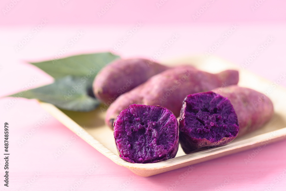Purple sweet potatoes on natural plate with pink background ready to eating