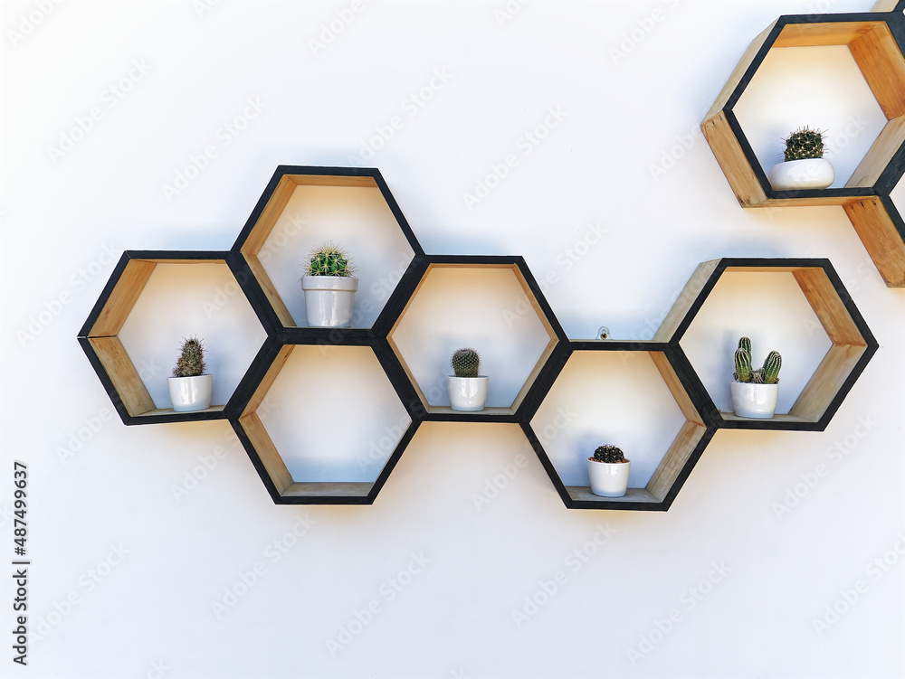 Potted Cacti on Hexagonal Shelves Against White Wall