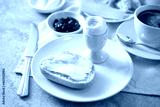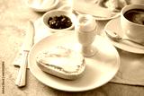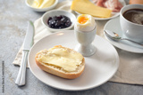 Bread roll with butter, cooked egg, jam and coffee on a breakfast table, selected focus