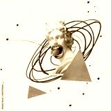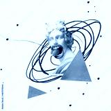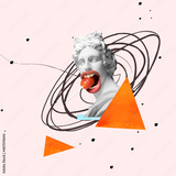 Contemporary art collage with make antique statue bust eating lolly, candy isolated over pink background with geometric figures